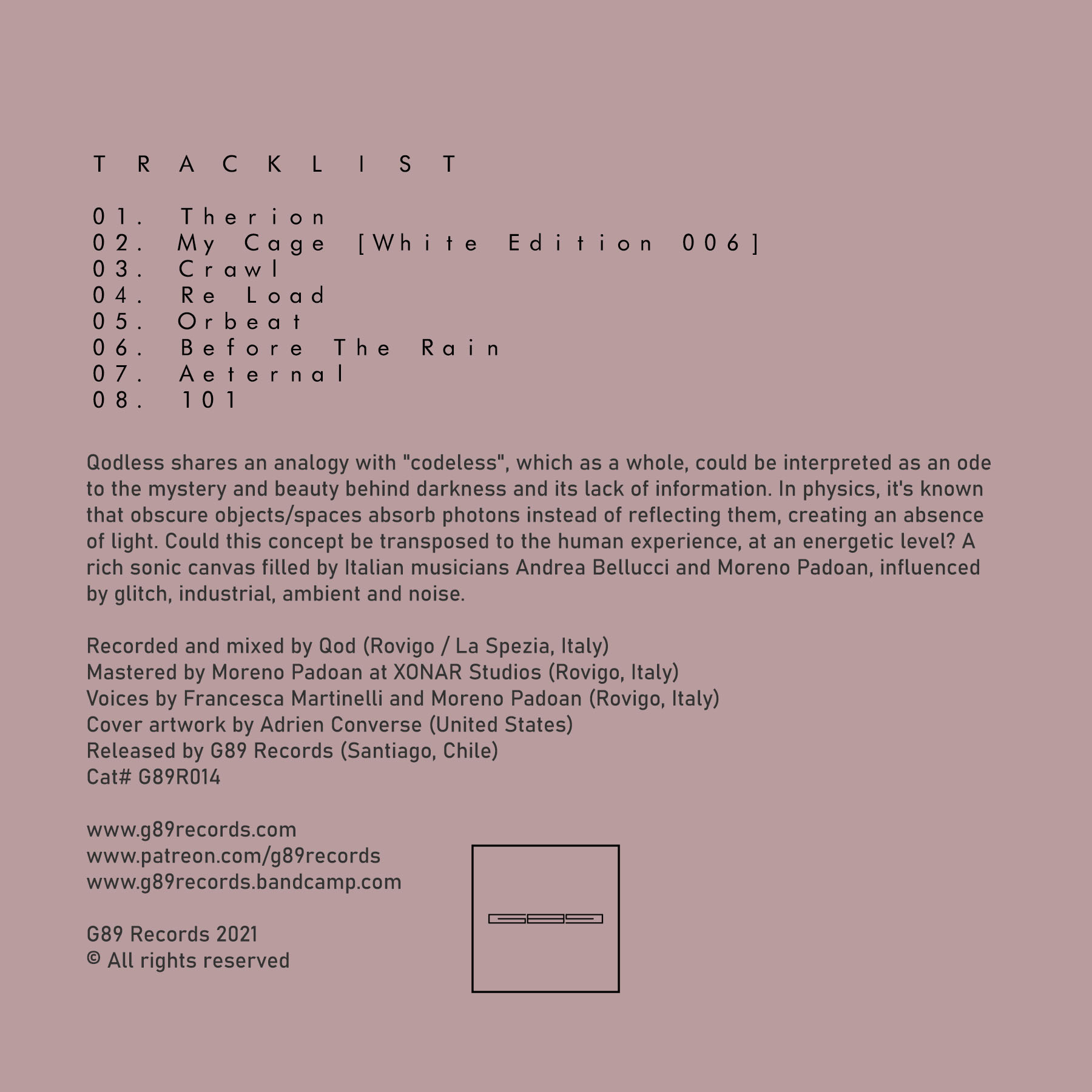 Para este final de año 2021, G89 Records llega al décimo lanzamiento, posibilitado por el dúo italiano Qod. Qod nació del encuentro de dos músicos que siempre se han estimado mutuamente por sus producciones musicales. Andrea Bellucci (y sus alias Red Sektor A, Subterranean Source, Iluiteq, Nerva), cuyo sonido se centra en refinado IDM, electrónica ambiental, y Moreno Padoan (también conocido como Artcore Machine, Otur Boyd, Mhole y Silicon Relic) y su electrónica más dura, caracterizada por el Glitch, el Industrial y el Noise.